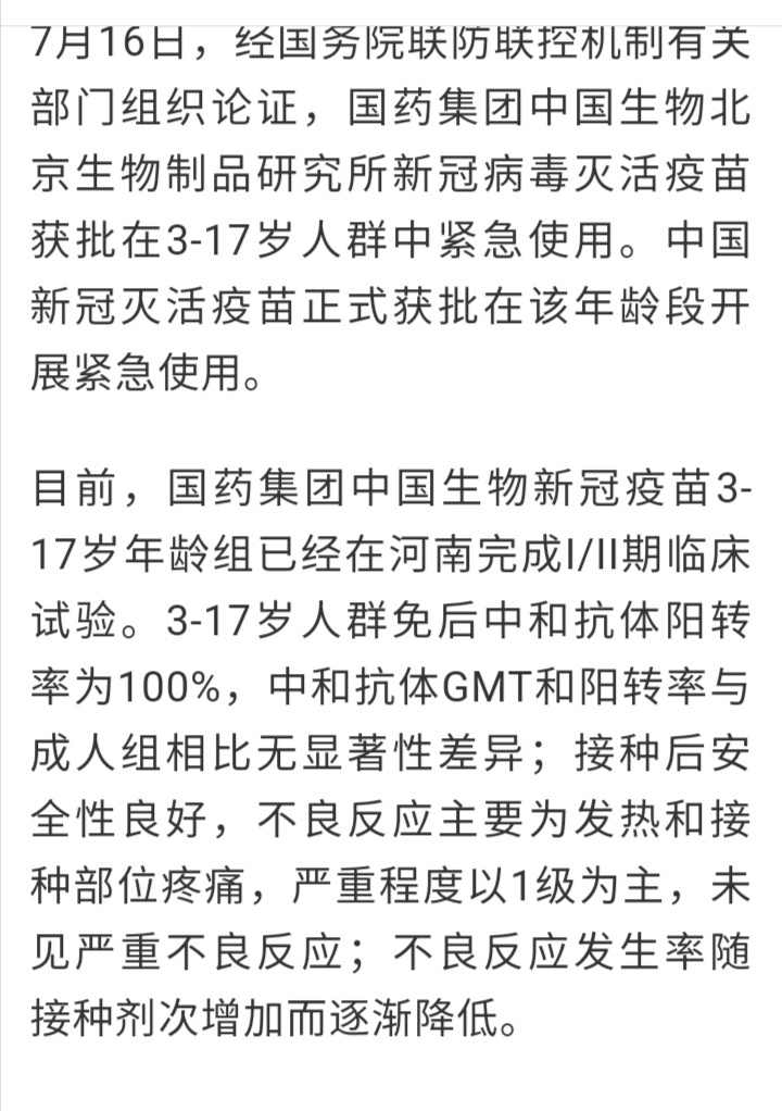 重磅!新冠疫苗3一17岁人群可用