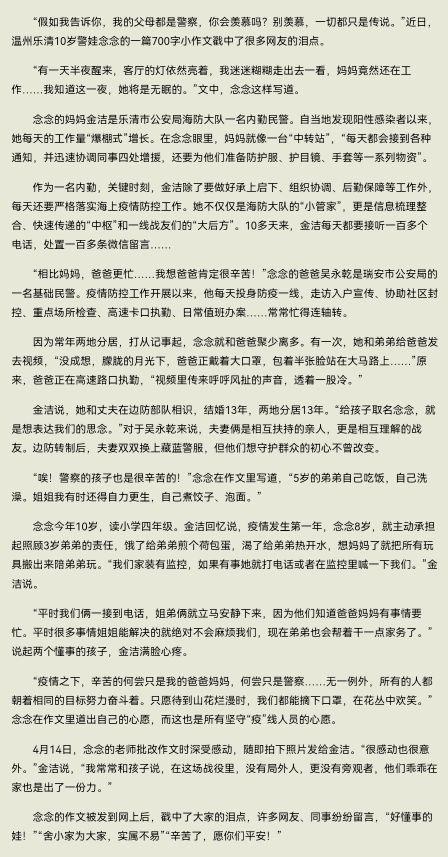 怪感人的,这是一篇乐清十岁小朋友写的作文,他的父母都是警察。疫情之下,防疫人员们真的太辛苦了