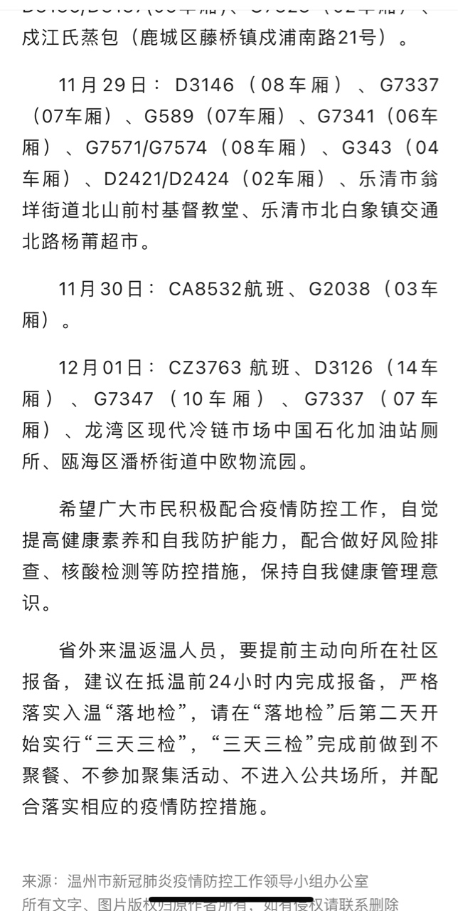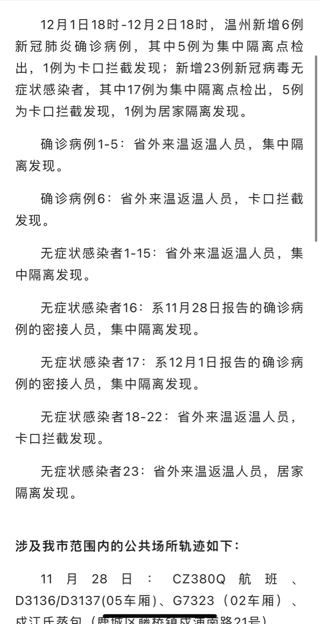 12月1日18时-12月2日18时,温州新增6例确诊和23例无症状,轨迹涉及乐…