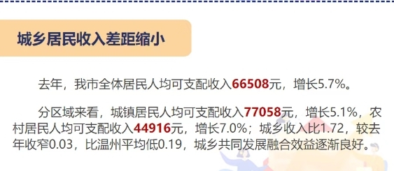 乐清人均可支配收入66508元,其中城镇77058元,农村44916元!
