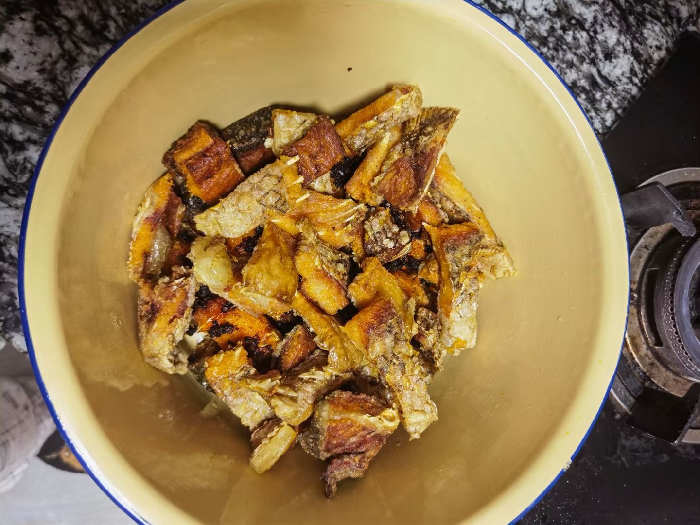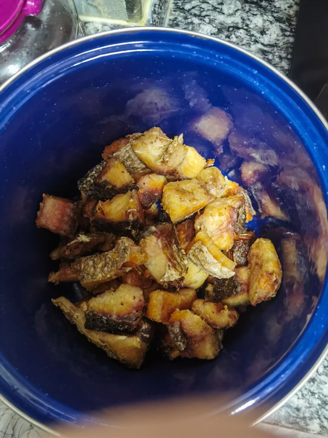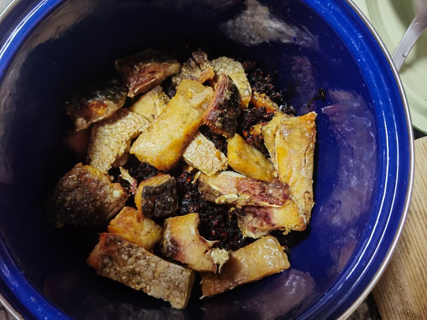偷师学艺分享给乐清小伙伴豆豉鱼制作流程:购每条10左右的草鱼-去鳞+背部剖开+鱼身斜刀-53度白酒+食盐+花椒抹匀-腌制+挂晾1周-洗净切块-油炸至鱼肉外焦黄-置入盆钵-一层鱼一层老干妈风味豆豉辣椒-倒入炸鱼冷却后的葵花油+橄榄油调和油-放置至少1周-大功告成!