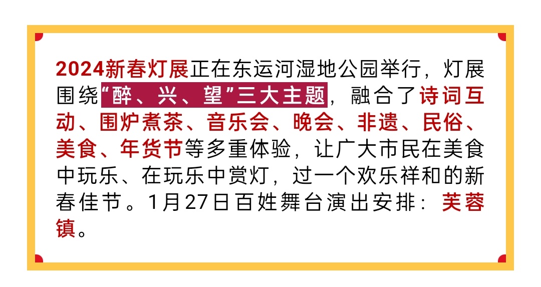 2024新春灯展正在东运河湿地公园举行,百姓舞台演出时间也订好了。