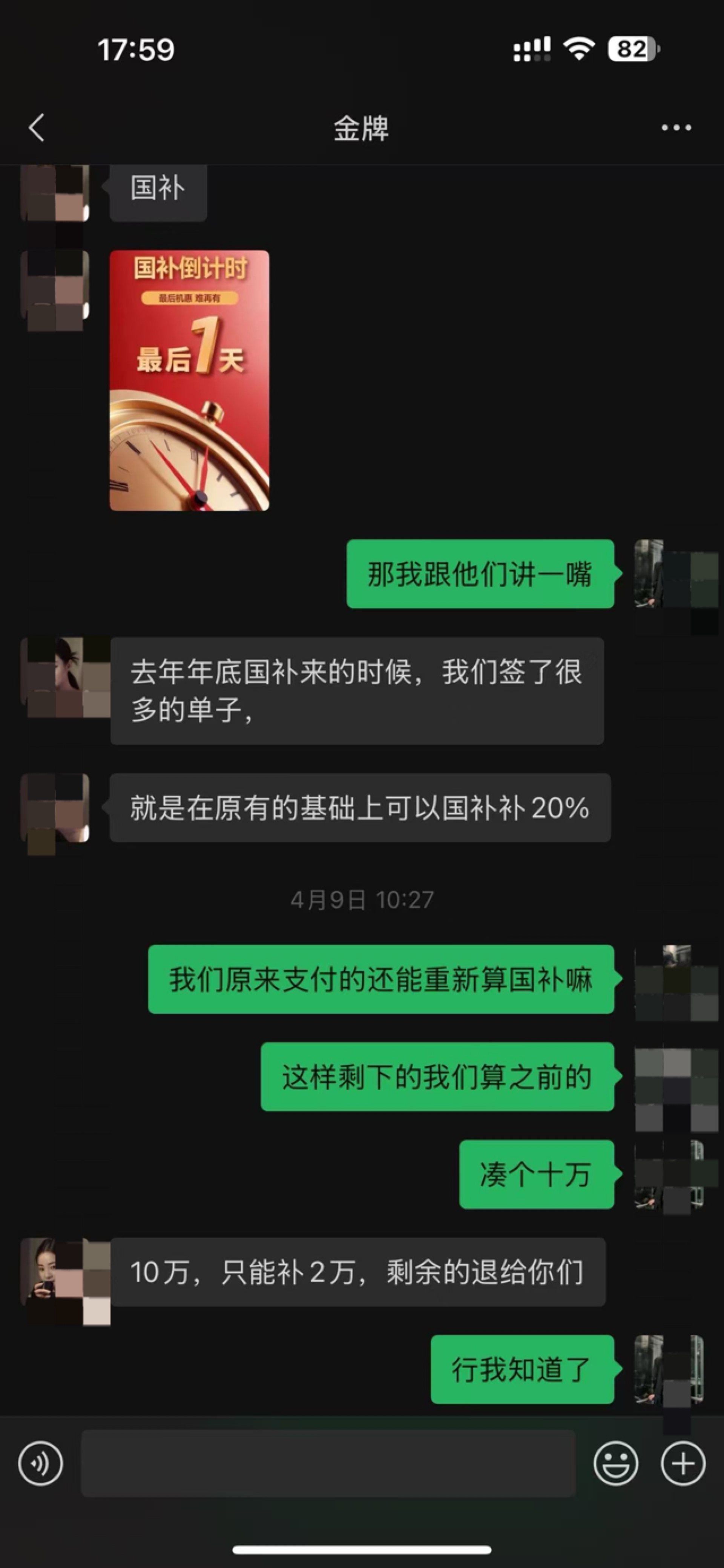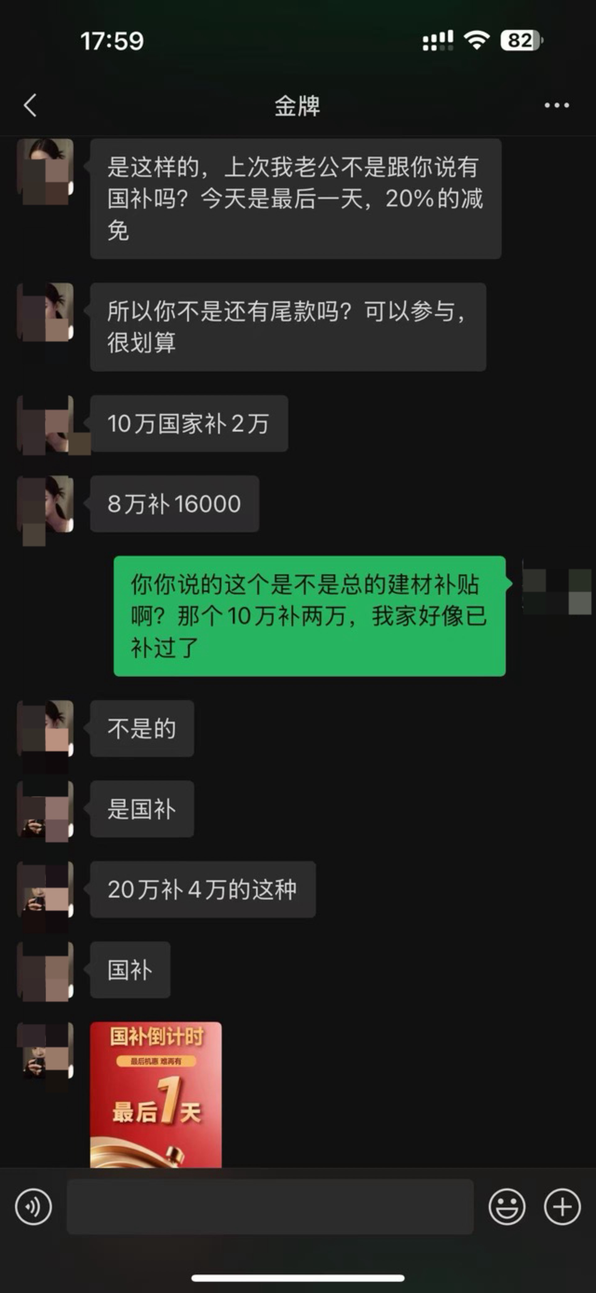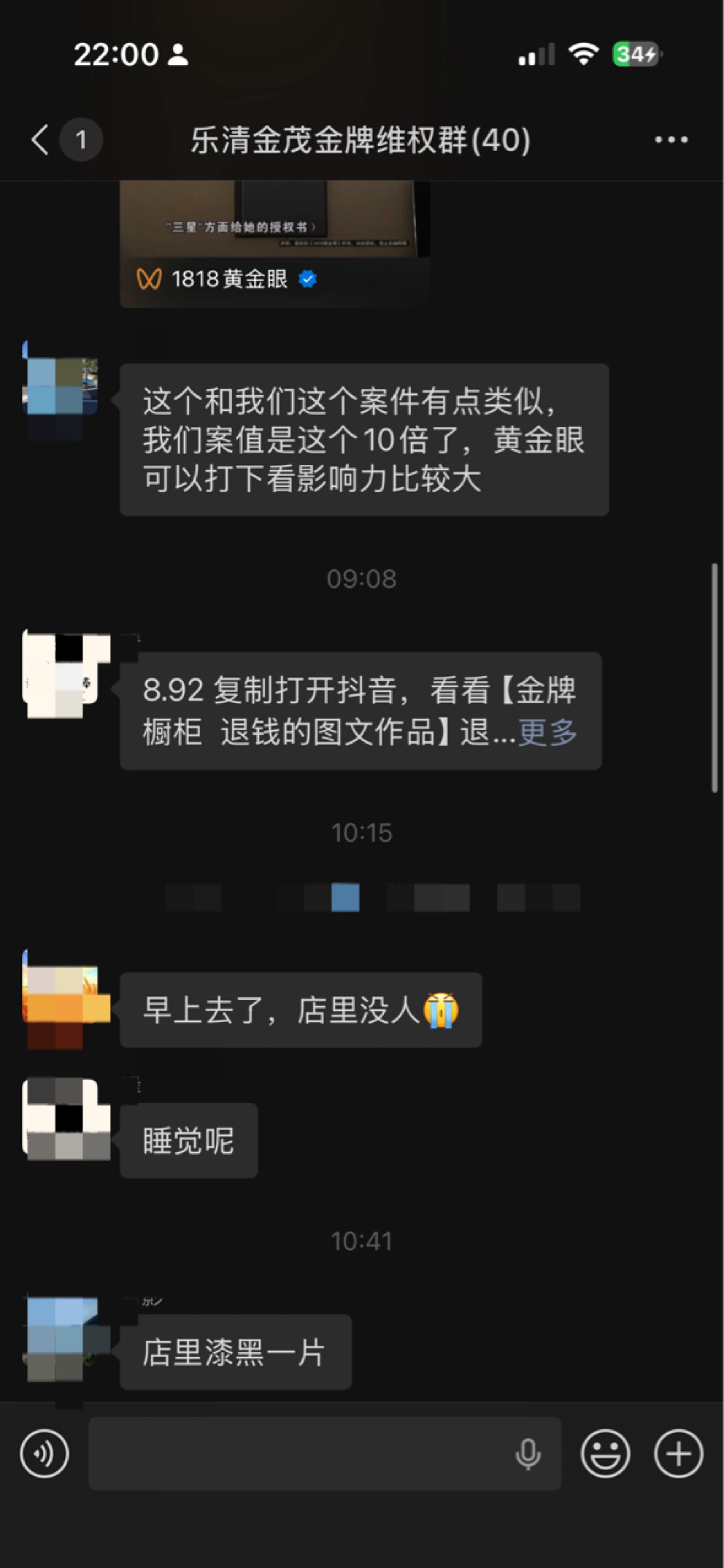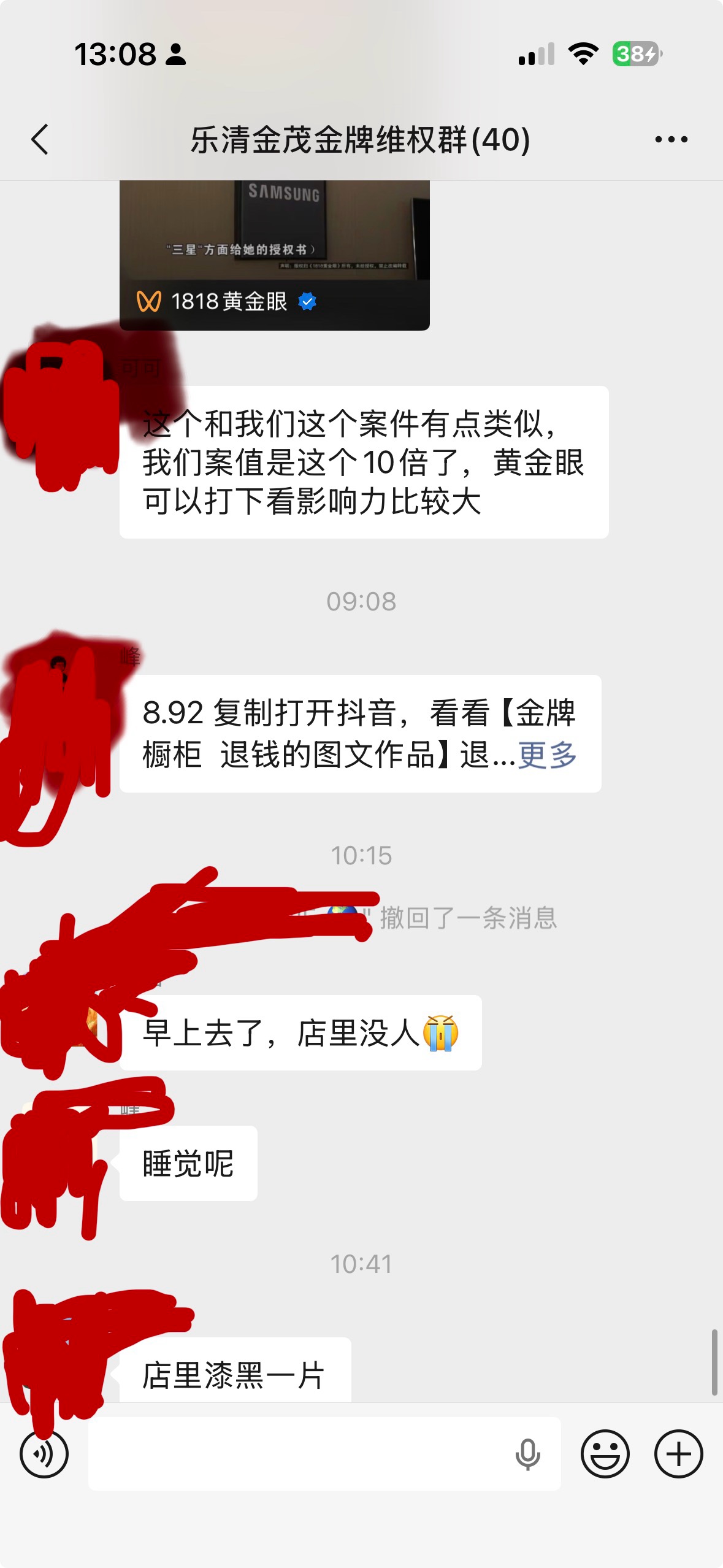 事情已经爆发一周,店已经被关电,没有工作人员。周一多名受害者去金茂管理处交涉,未得到具体的解决方案,只是说协助联系金牌总部解决。截止25日维权群已经达到40人,涉及客户30多户,金额超300多万。金牌总部也一直没有解决方案,温州总代理去厦门也没结果回复。城南派出所以也不立案,具体理由不方便透露(可能我也理解不了)。大家会好奇为什么会涉及这么多金额。据维权群反映,老板娘是以享受国补的名义让客户交齐款项,而且多次以国补最后一天或者以国补数额没了等虚构项目诱导客户补齐款项。甚至部分客户装修完了,老板娘还和他们说能享受国补导致部分客户受损聊天记录我图上有,大家可以了解一下,也给大家提个醒