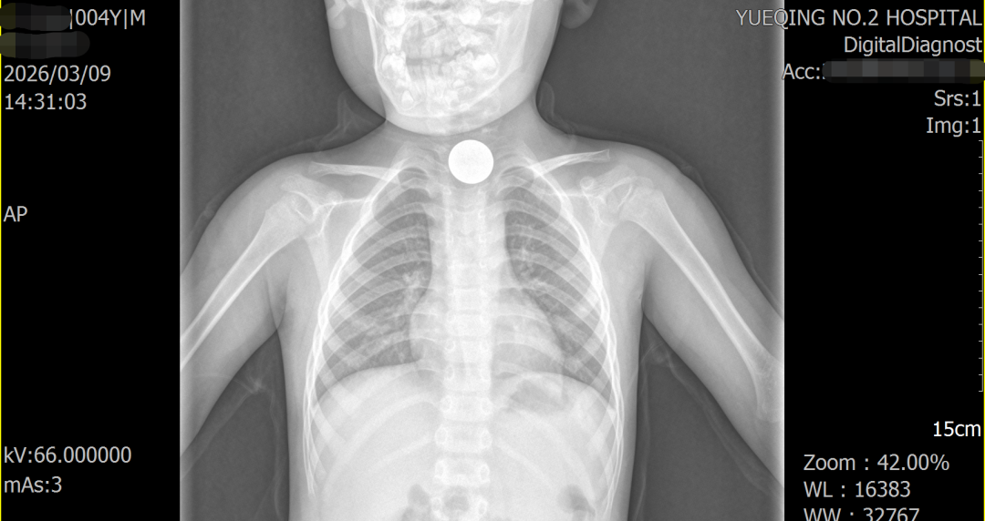 事情的起因,是小宝突然指着胸口告诉妈妈身体不舒服。起初家长以为只是孩子撒娇,可在孩子反复诉说不适后,家人立刻带他前往乐清市二医检查。一张 X 光片,让所有人的心都揪了起来 —— 小宝的食道入口处,清晰可见一枚一元硬币。家人仔细回忆才想起,这枚硬币大概率是孩子两个月前玩耍时不慎吞下的,当时孩子只有短暂哭闹、食欲变差,没多久就恢复正常,谁也没料到,硬币竟悄悄卡在了食管里。
