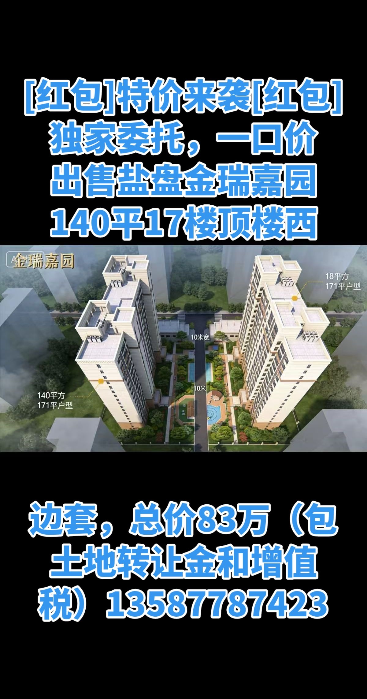 出售盐盘金瑞嘉园140平17楼顶楼西边套,总价83万(包土地转让金和增值税)13587787423