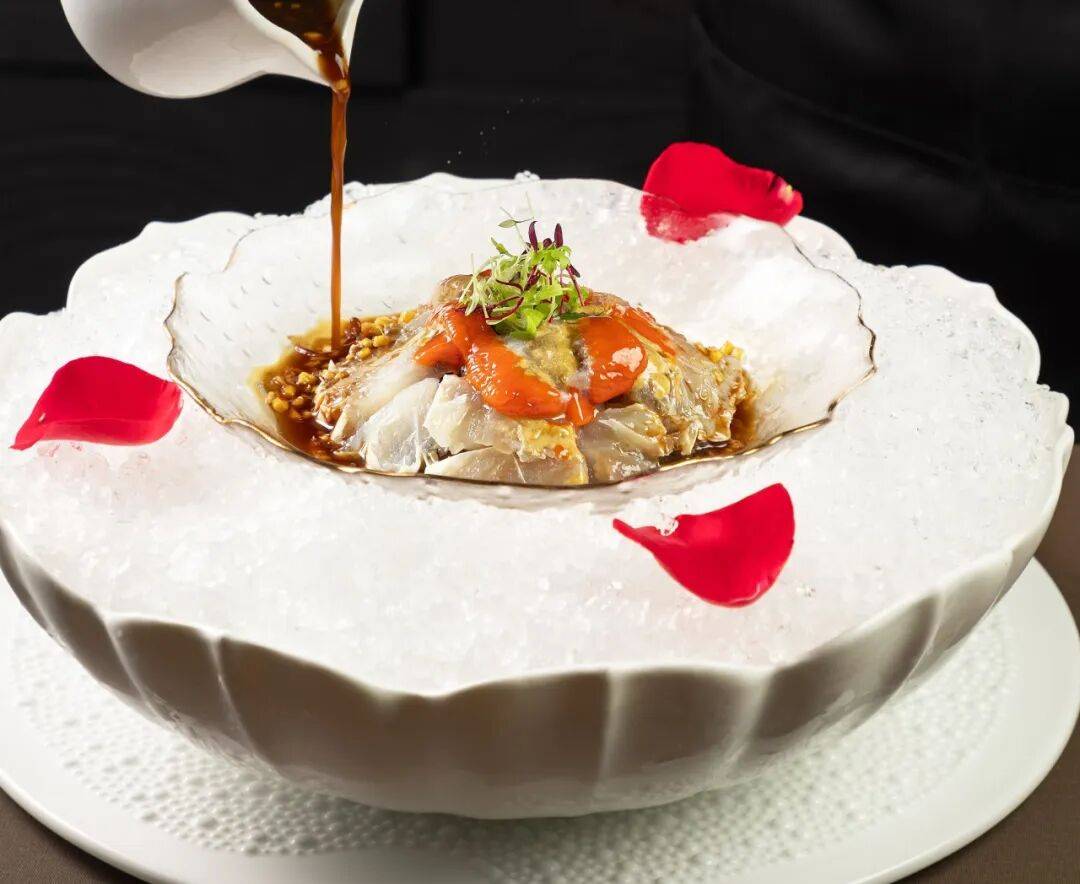 「璞邸·江景餐厅」以瓯菜为魂,以融合为境,九层塔咖喱北海道松叶蟹配芝麻、海钓野生小黄鱼烧花胶公、花雕生醉小青龙等菜品,在瓯江畔铺开一席山海交融的味觉盛宴。