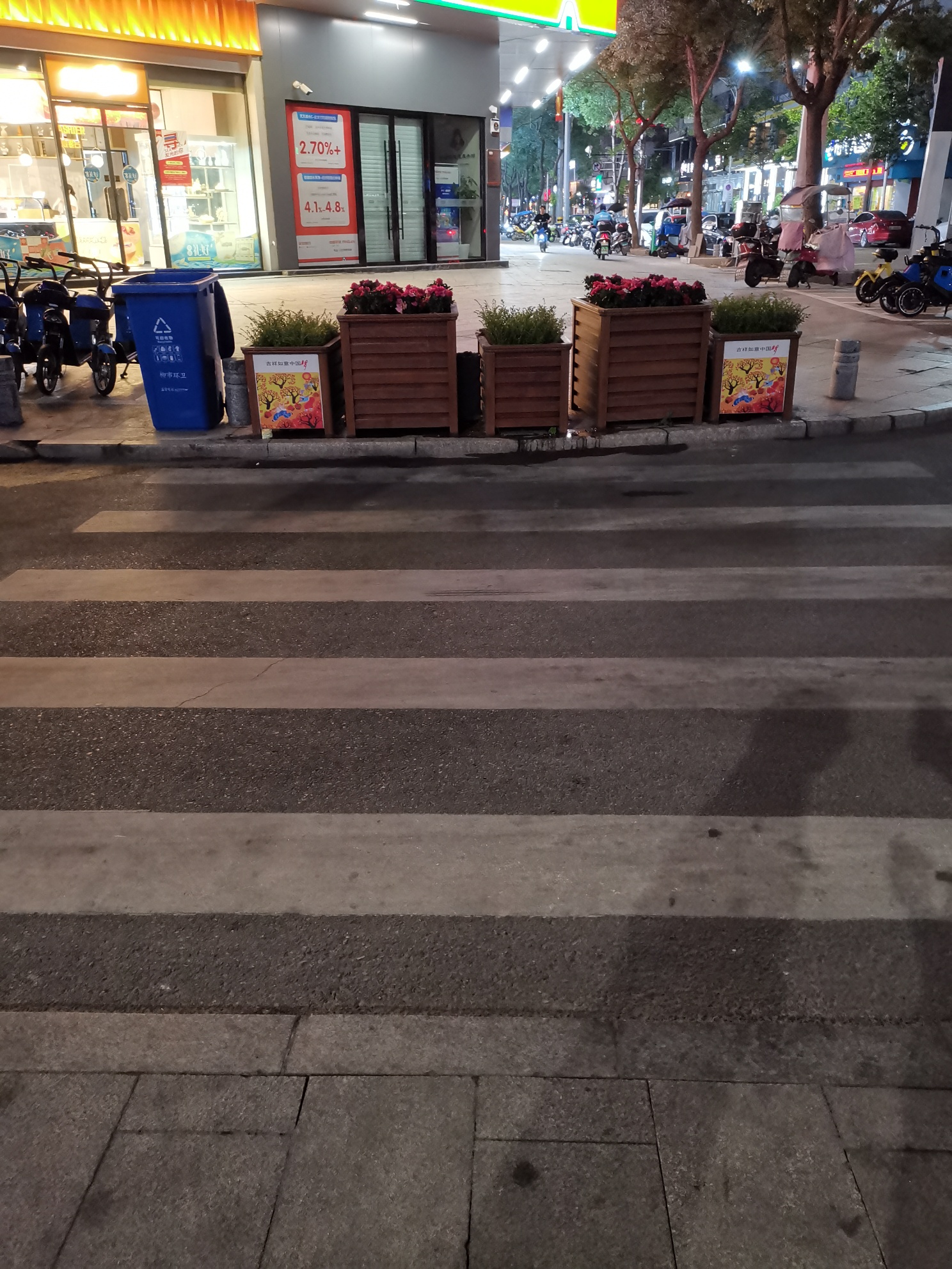 柳市共享电瓶车,垃圾桶,花盆还堵斑马线两头呢,城管交警哪个出来管了,违停车贴的很带劲