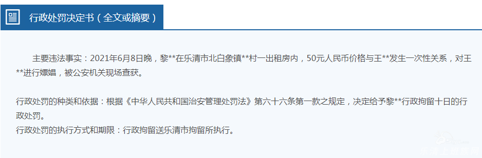 主要违法事实:2021年6月8日晚,黎**在乐清市北白象镇**村一出租房内,50元人民币价格与王**发生一次性关系,对王**进行嫖娼,被公安机关现场查获。 行政处罚的种类和依据:根据《中华人民共和国治安管理处罚 ...