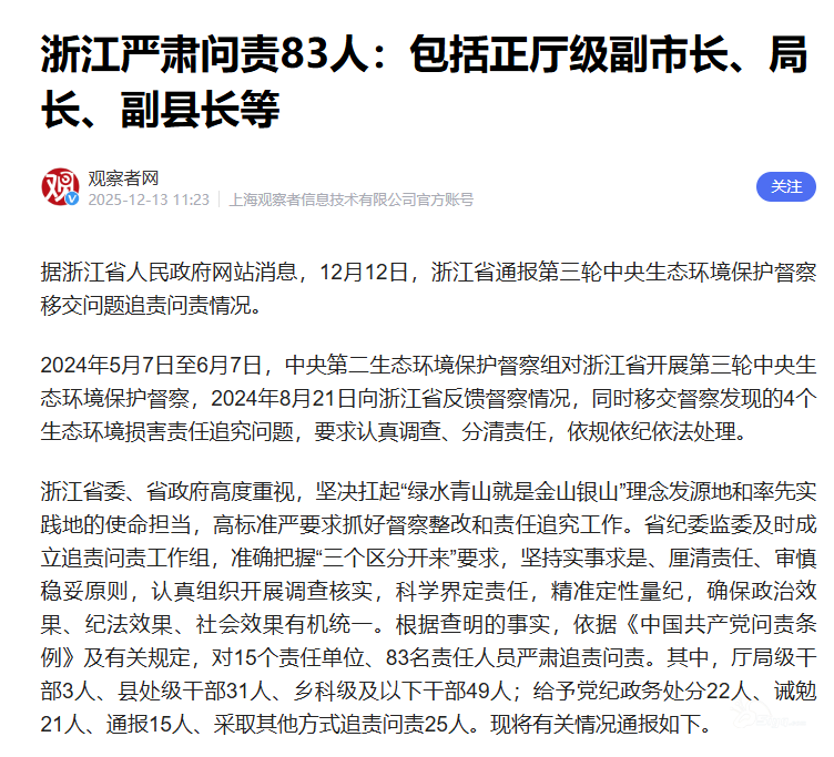 浙江严肃问责83人:包括正厅级副市长、局长、副县长等