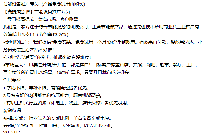 节能设备推广专员(产品免费试用再购买) 【高提成急聘】节能设备推广专员 | 零门槛高提成 | 蓝海市场,客户刚需 我们是一家专注于综合节能服务的科技公司。主营节能器产品,通过先进技术帮助商业及工业客户有 ...