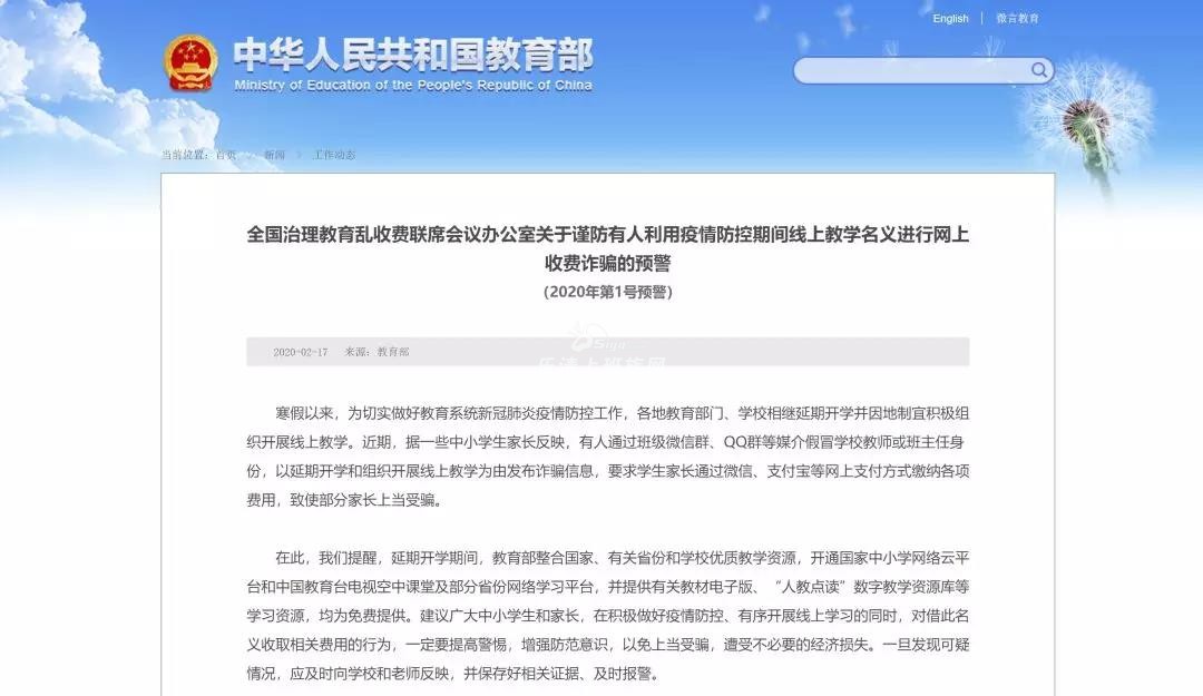 2月17日,教育部网站发布《全国治理教育乱收费联席会议办公室关于谨防有人利用疫情防控期间线上教学名义进行网上收费诈骗的预警(2020年第1号预警)》,内容如下—— 寒假以来,为切实做好教育系统新冠肺炎 ...